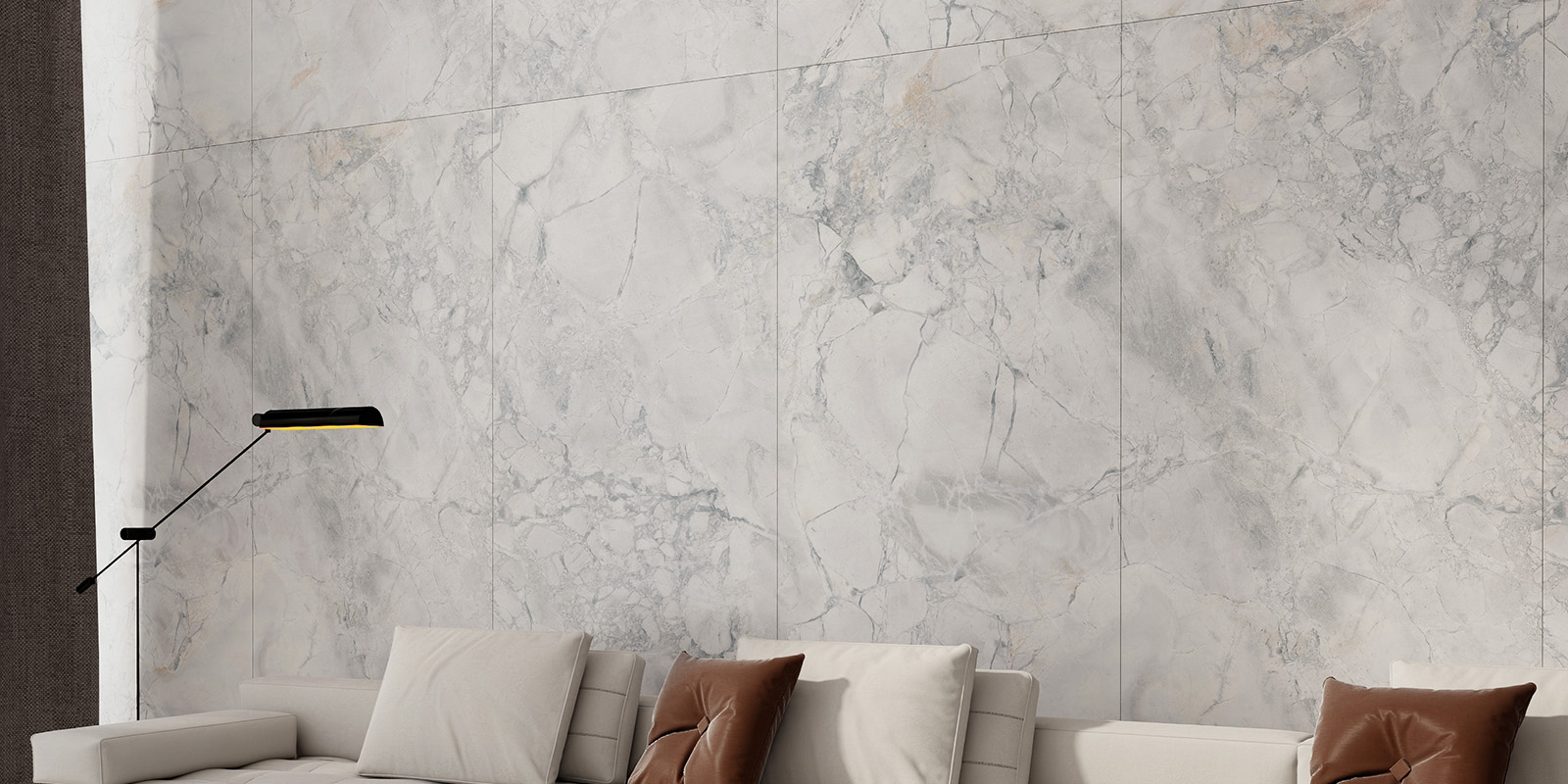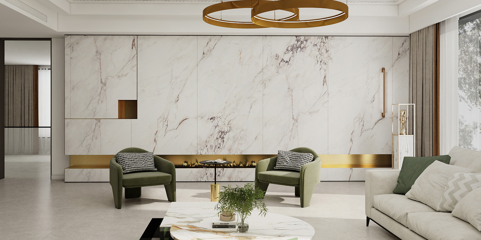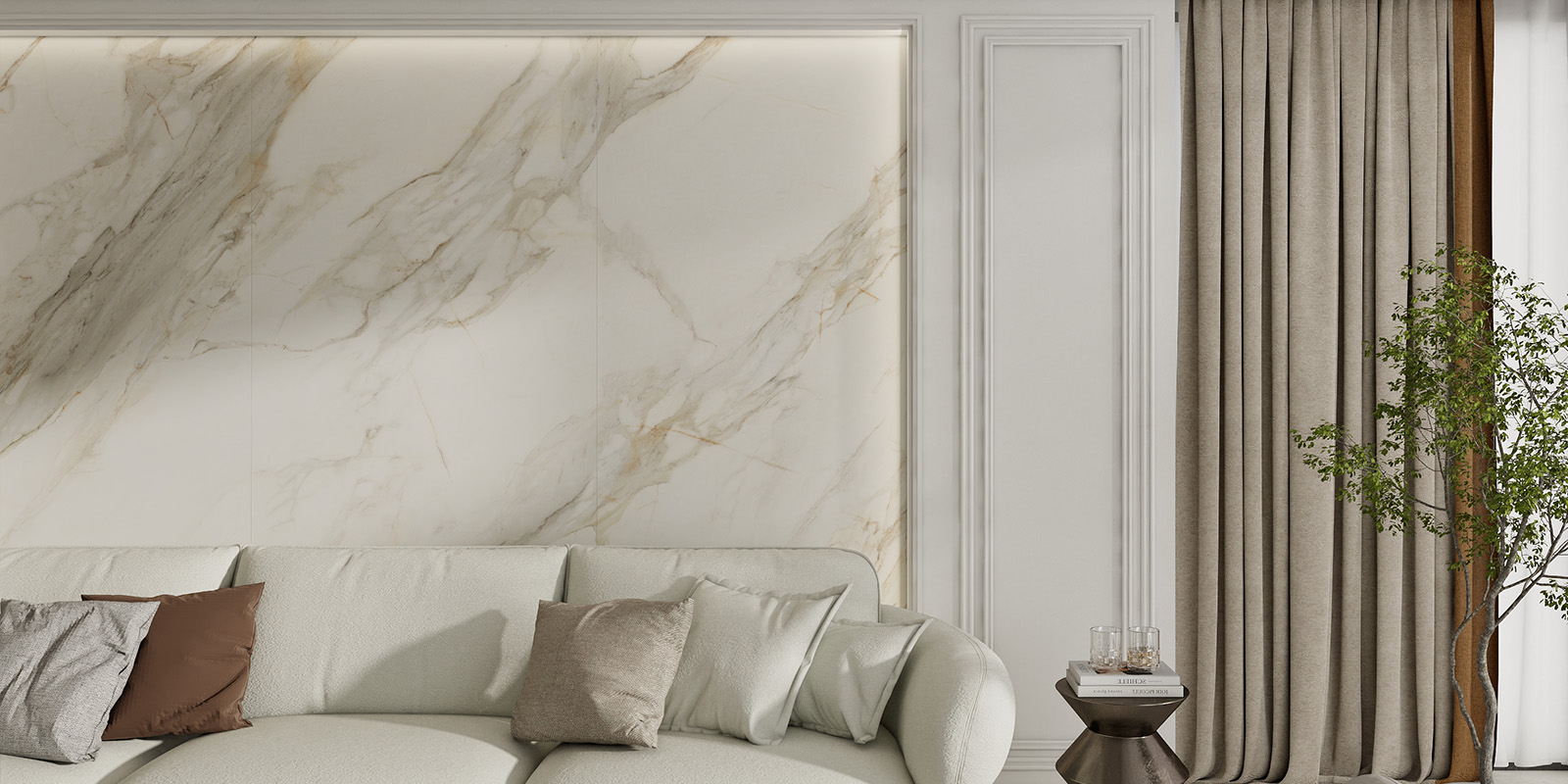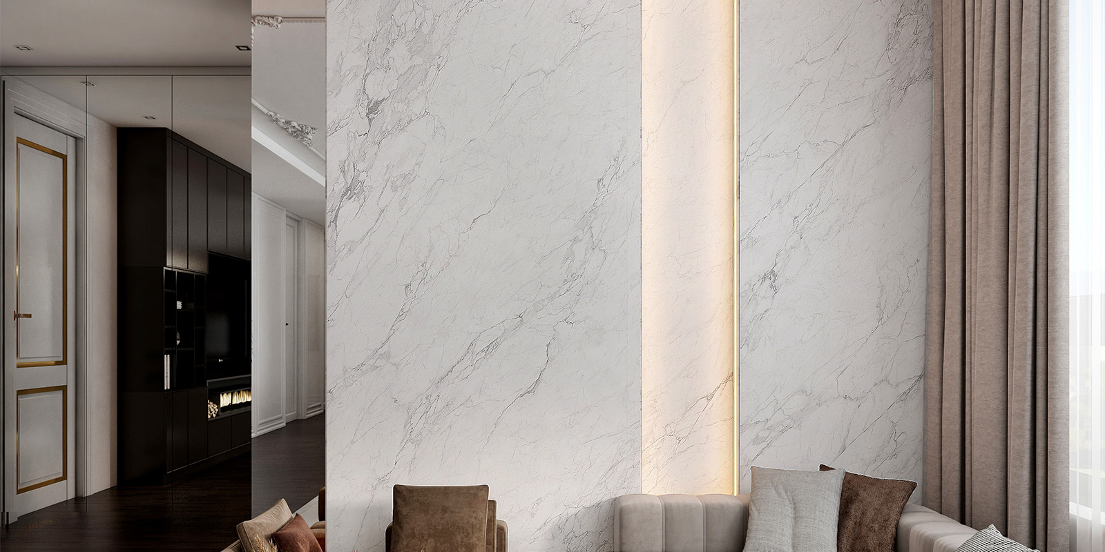 精选天然大理石材,1200X2780MM,6毫米厚度,柔雅精雕和柔雅微光工艺,一片到顶,适用空间更广